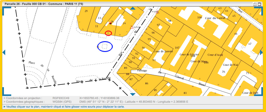 Tout d'abord où est exactement le 10 place de la Bastille ? Google Maps ou Google Earth nous disent que c'est du côté de la rue de la Roquette, mais rien de très précis. Le plan cadastral de Paris lui est plus précis et nous indique exactement le n° 10 :