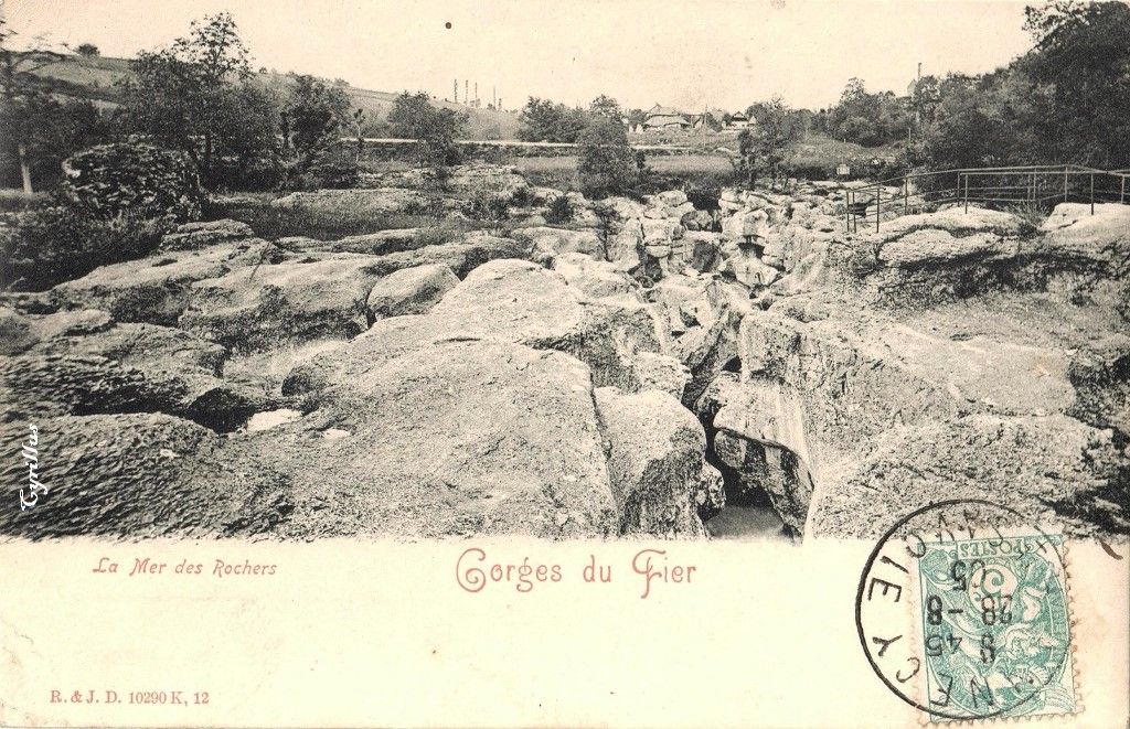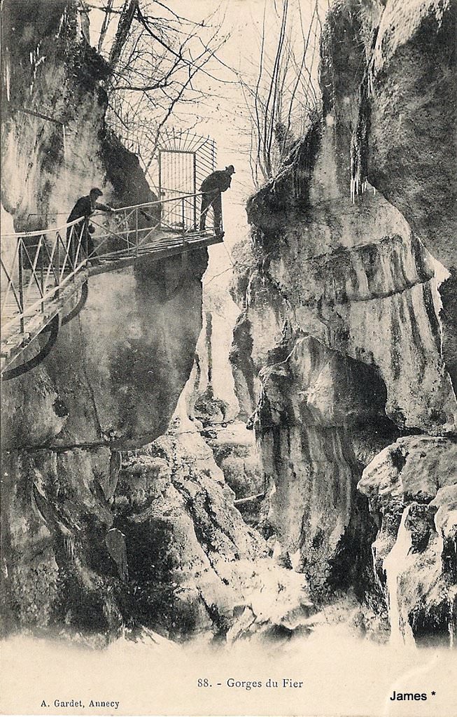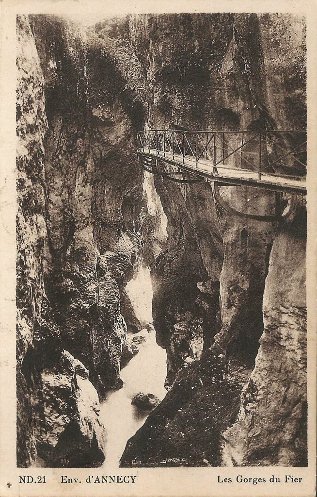 Les Gorges du Fier, un site naturel aménagé à 10 Km à l’ouest d’Annecy, proche d’Aix-les-Bains, Chambéry et Genève. Un canyon spectaculaire et étroit où l’on avance sur une passerelle fixée dans le rocher à 25 mètres au-dessus de la rivière. Carte numéro 413 publiée par A.Gardet, Annecy.