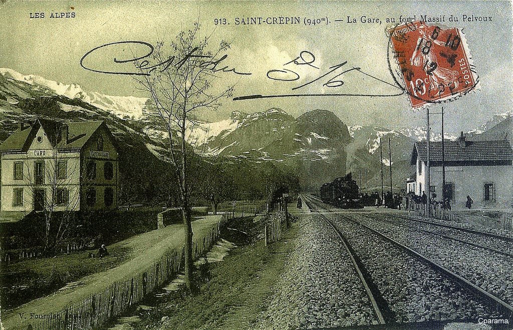 SAINT-CREPIN (Hautes-Alpes 940 m.) - La gare et le train, au fond, Massif du Pelvoux - Editeur : V.Fournier à Gap n°913.