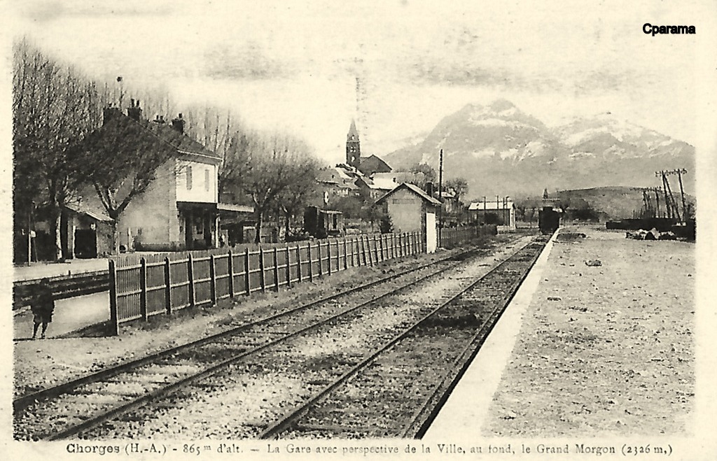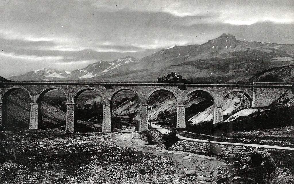 Avant le Lac de Serre-Ponçon, voici le Viaduc et la Route du Thubaneau (au fond, Pic de Chabrières, 2405 m). Le viaduc (du Thubaneau en raison d'un lieudit voisin) c’est une ouvrage en maçonnerie, maintenant noyée, de l'ancienne ligne de Briançon qui comportait 11 arches plein cintre. Son architecture est intacte à l'exception de ses rambardes métalliques qui ont été récupérées avant mise en eau du lac pour servir de grilles et fermer les tunnels qui allaient être noyés. Situé dans un point bas du lac, il n'apparaît que très rarement, lorsque le niveau des eaux est particulièrement bas.