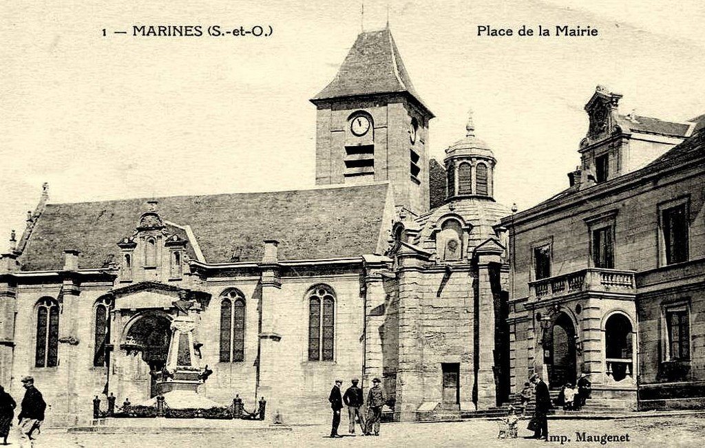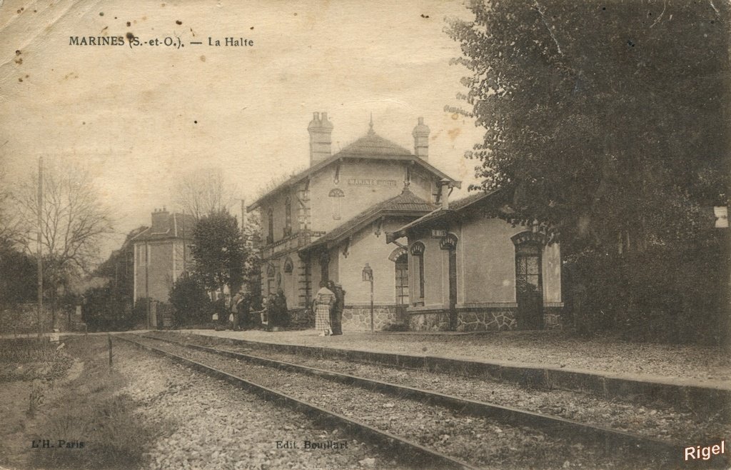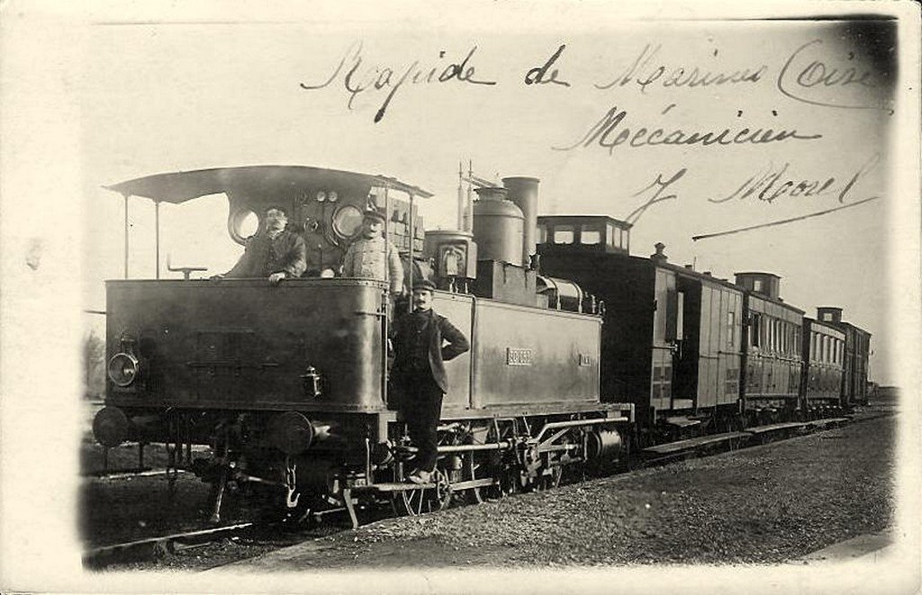 Nous voyons, ci-dessus, un court train à vapeur, remorqué par une machine tender 030 T, qui faisait la navette sur la petite ligne de Chars à Marines, longue de 6 km, certainement la plus petite ligne de chemin de fer du grand réseau de l'Ouest-Etat. Cette ligne(tte) avait été mise en service en 1911 et ne desservait que la station intermédiaire de Marines-halte (vue sur le post précédent). Il existait 5 aller-retour par jour qui parcourraient les 6 km en 22' à l'horaire de Mai 1914, puis 4 aller-retour en 1918. En 1936, un autorail Renault assurera une partie du trafic des voyageurs. Cet itinéraire sera fermé en 1939 pour les voyageurs et en 1951 pour les marchandises.
