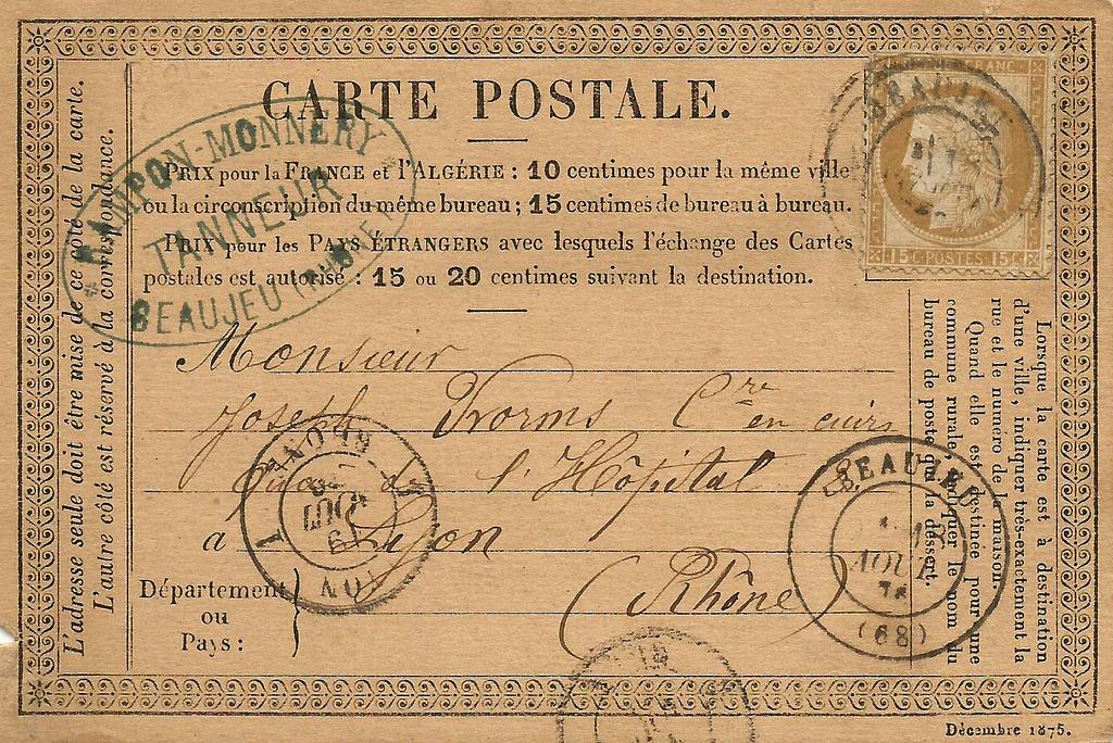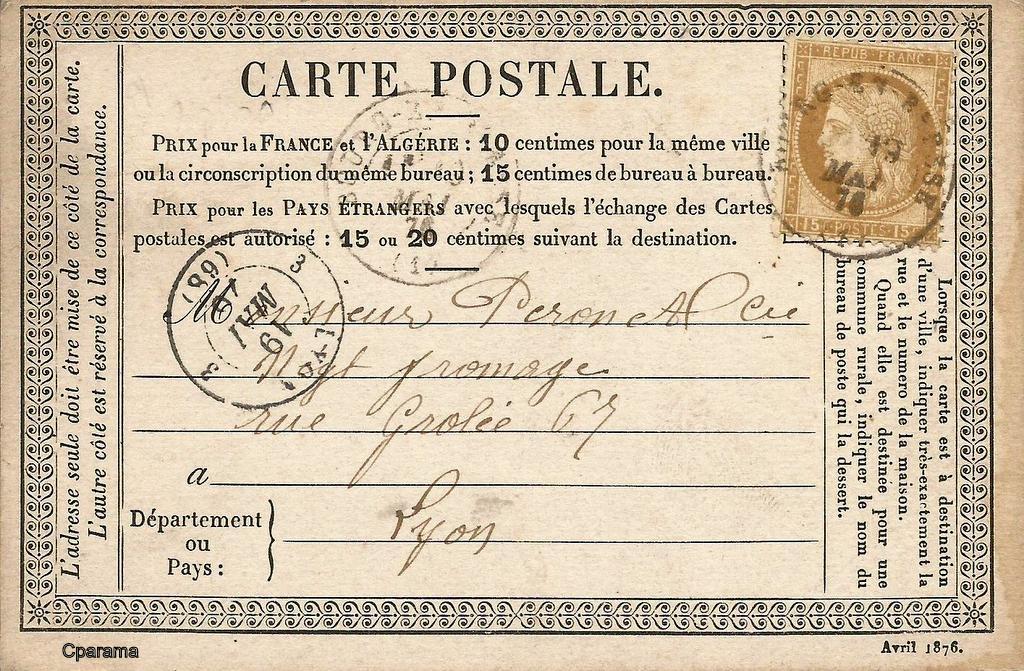 Carte Postale Précurseur, postée le 18 Août 1876, ayant voyagé entre Beaujeu et Lyon.