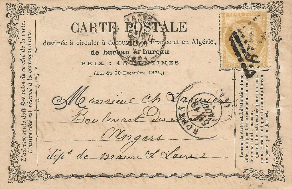 Carte Postale Précurseur, postée le 19 Aout 1873, ayant voyagé entre Rouen et Angers.