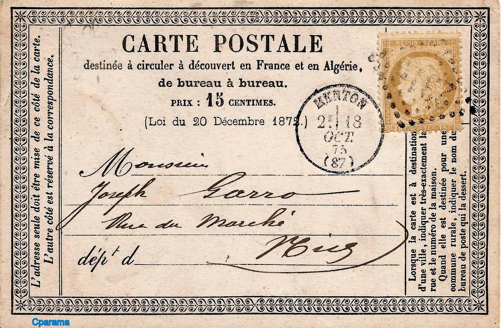 Carte Postale Précurseur à destination de Nice, expédiée de Menton le 18 Octobre 1875.