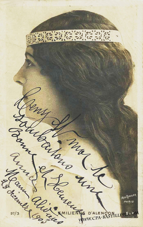 Cécile Sorel, comtesse de Ségur, de son vrai nom Céline Emilie Seurre, est née à Paris le 7 septembre 1873. Elle débuta une carrière théâtrale en 1889, à l'Eden Théâtre dans « Orphée aux enfers ».