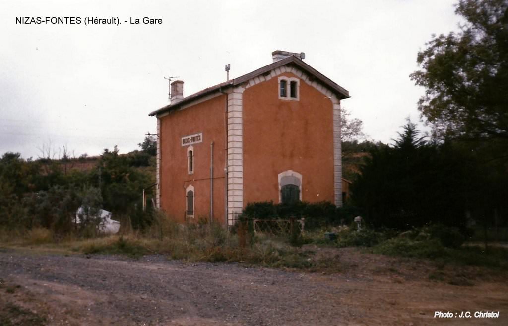 Ligne Paulhan-Faugères - La gare de Nizas-Fontès (Hérault) en Novembre 1984, sans rails et sans trains - Photo : J.C. Christol.