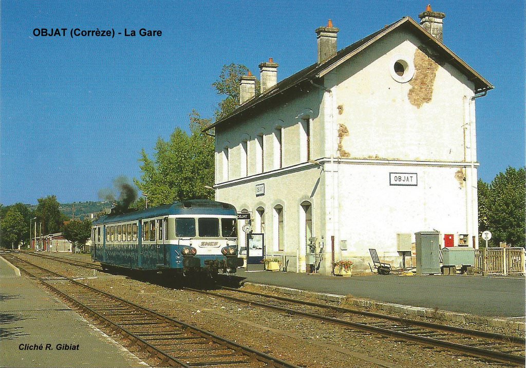 L'autorail X 2917, assurant la relation Pompadour-Brive, quitte la gare d'OBJAT (Corrèze) en Septembre 2003 - Cliché R. Gibiat.