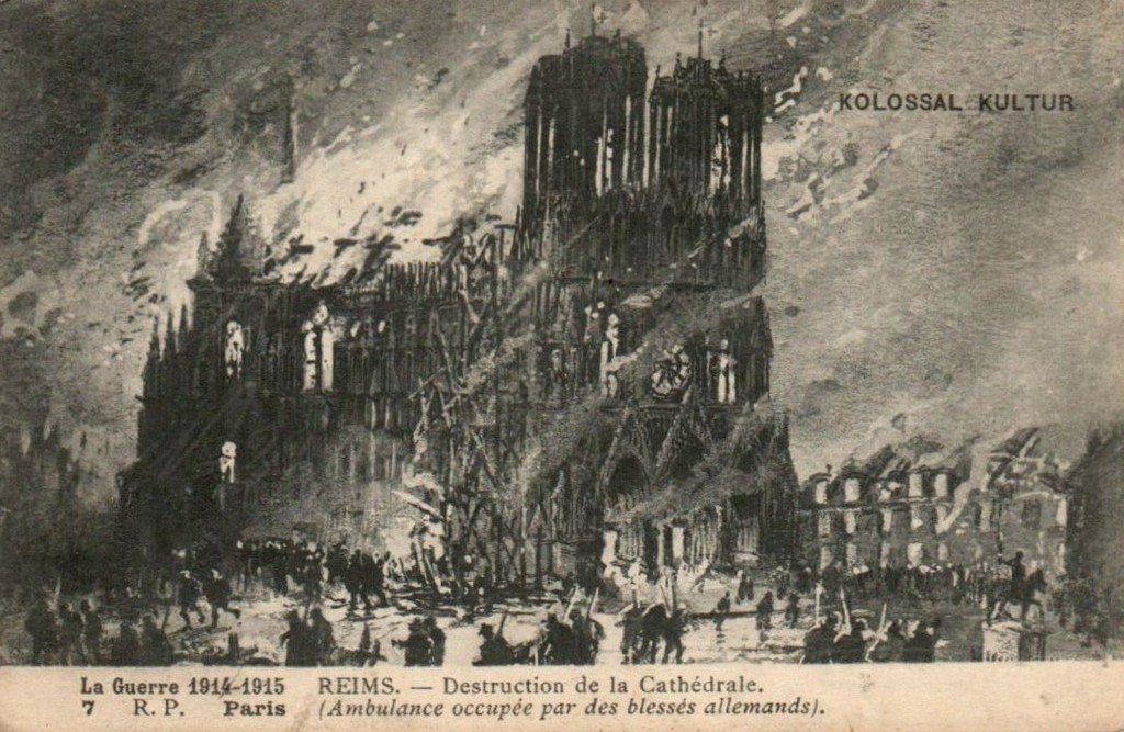 REIMS dans ses années de bombardement 1914-1917 - La Cathédrale incendiée par les Allemands, le 19 Septembre 1914 - Vue prise de Claimarais à 16 h. 30
