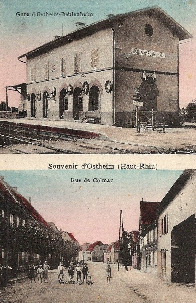 Souvenir d'OSTHEIM (Haut-Rhin) - La Gare et la rue de Colmar.