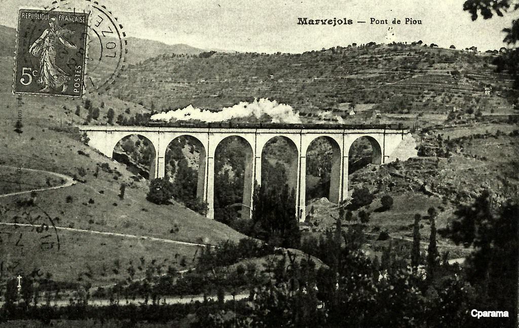 L'automotrice "ZGC" Z 27849/27850, assurant une relation Béziers - Saint-Chély-D'Apcher, franchit le viaduc du Piou (Longueur : 174 m., hauteur 62 m.) peu avant MARVEJOLS (Lozère) en Mars 2009 - Collection et photo René Gibiat.