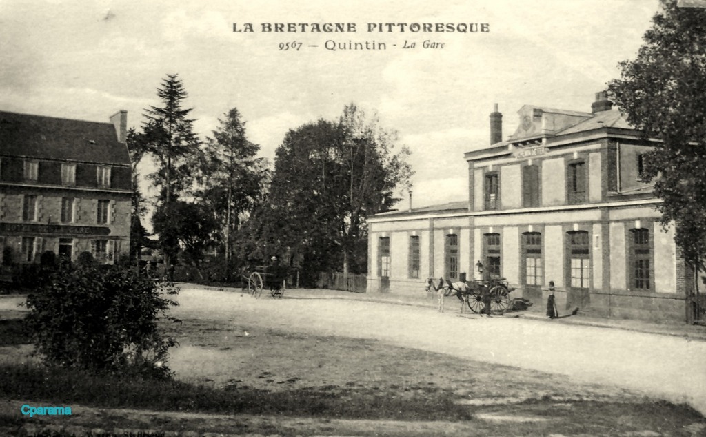 Quintin est située dans le département des Côtes-du-Nord (Côtes-d'Armor aujourd'hui) à 20 kilomètres au Sud-Ouest de Saint-Brieuc. Depuis plus de 100 ans, sa population est stable, 2838 habitants lors du dernier recensement de 2017 contre 2637 en 1914. La gare ci-dessus, se trouve sur la ligne reliant Saint-Brieuc à Pontivy.