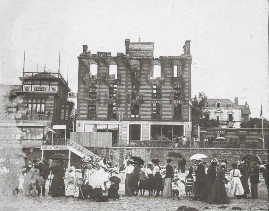 L’incendie de l’Hôtel des Terrasses du 10 août 1900 a été relayé par des dizaines de journaux De Dinard : L'Hôtel des Terrasses, situé sur la plage, à côté du Casino, a été complètement détruit, avant-hier, par un incendie. Le feu a pris naissance au rez-de-chaussée, dans un petit office spécialement affecté aux lampes et aux bougeoirs. Il était midi et la cloche du déjeuner venait de sonner. En dix minutes, tout le premier étage était déjà en flammes. Le propriétaire, M. Cuvelier, qui se trouvait à côté de l'office où le feu a éclaté, n'a eu que le temps de se sauver sans même pouvoir ouvrir son coffre-fort. Tout secours était inutile : il n'y avait plus qu'à s'occuper de préserver le Casino et les villas d'en face, sérieusement menacés par les flammes violemment poussées de ce côté par le vent.