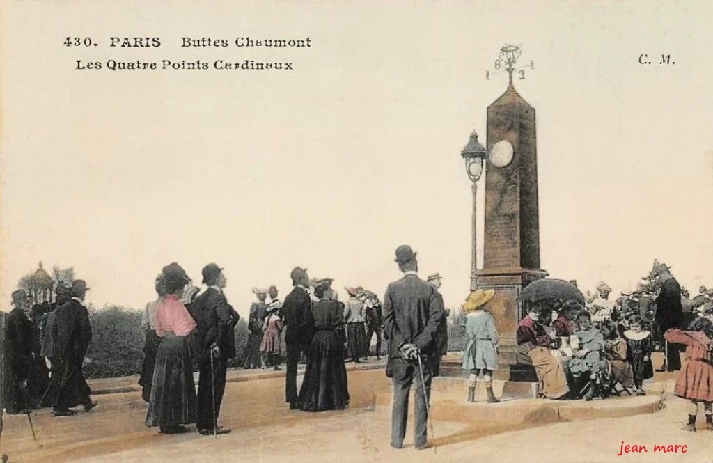 14 juillet 1883 — Inauguration du Monument des Quatre points cardinaux — L'Obélisque-indicateur. On vient d'ériger dans, le parc des Buttes-Chaumont une colonne qui est à la fois une colonne météorologique et un indicateur précieux pour les habitants du quartier. Elevée sur un refuge en bétons agglomérés, elle a la forme d'un obélisque quadrangulaire posé sur un socle carré qui, à sa base, forme banquette.
