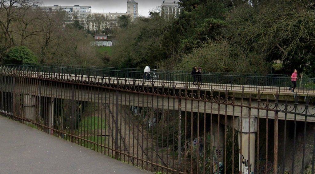 Parc des Buttes-Chaumont - Le pont de l’allée de Crimée franchissant la petite ceinture (cliché Rigouard, Cparama)