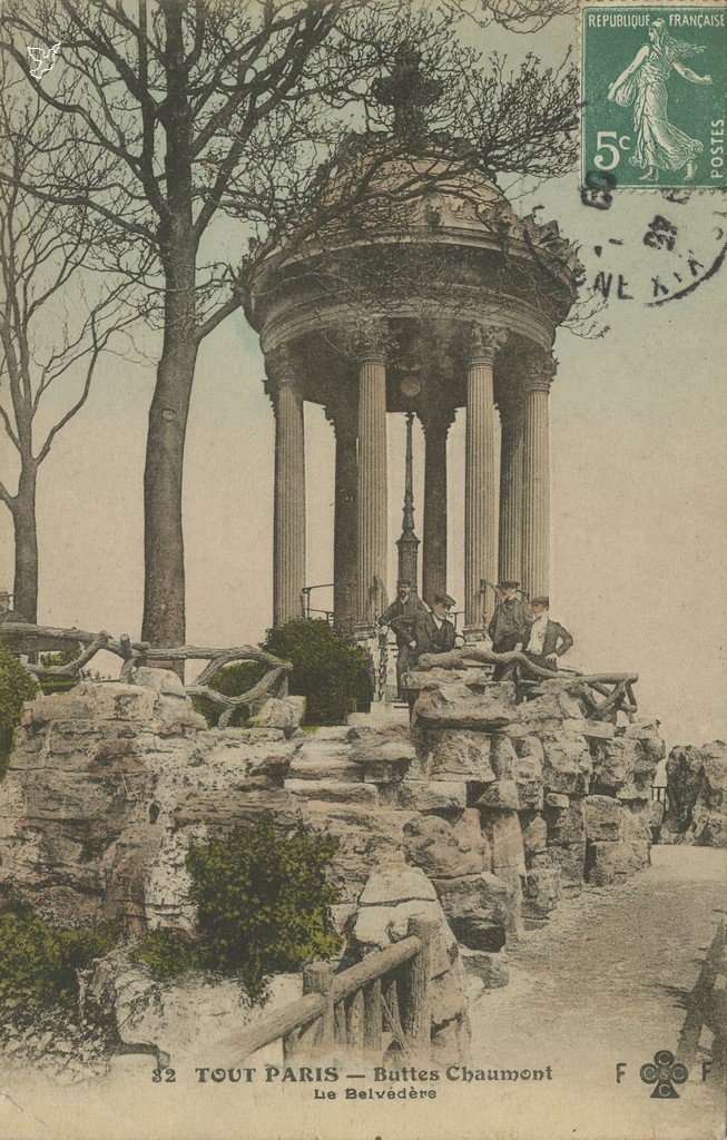 Le Belvédère constitue la curiosité essentielle du Parc des Buttes Chaumont ; c’est autour de ce bloc de gypse d’une trentaine de mètres de haut, qu’on a entouré d’un lac artificiel et surmonté d’une Rotonde, que le jardin a pu se créer.