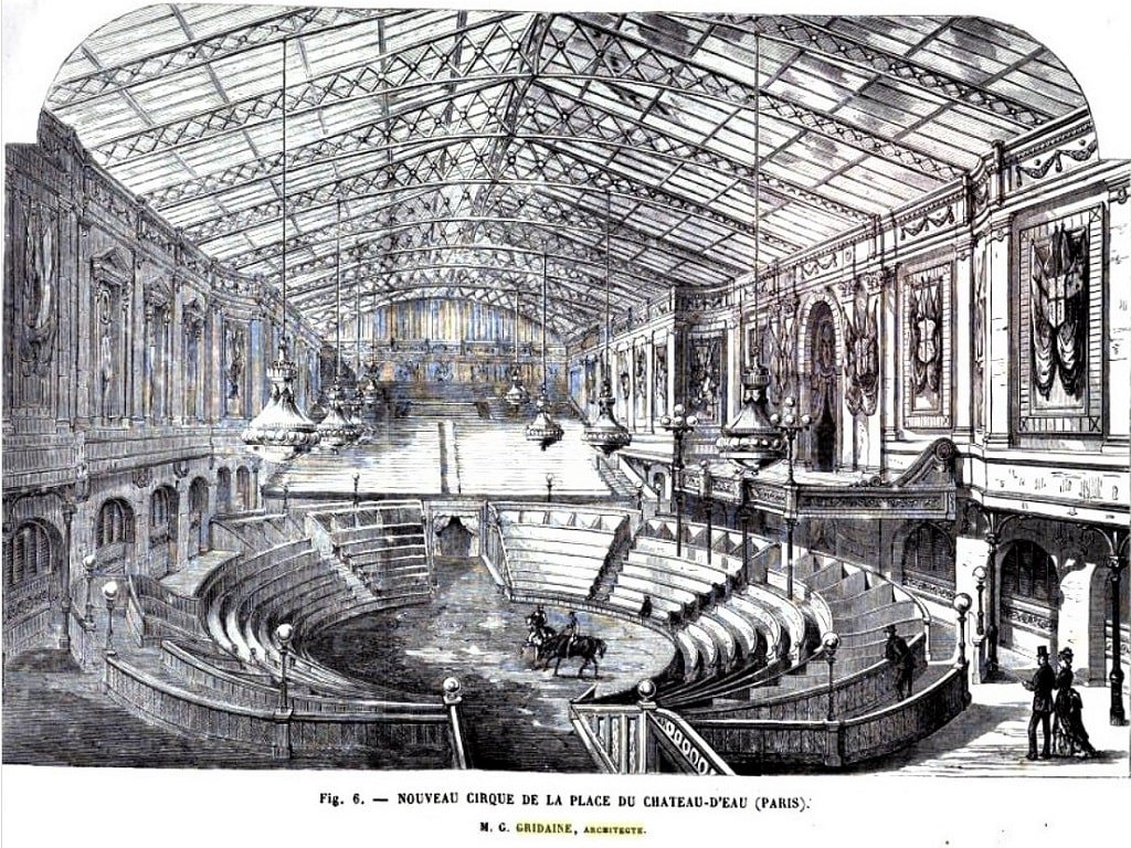 Plusieurs projets de transformation sont étudiés et les locaux sont mis en vente au prix de cinq millions de francs, sans succès. Finalement le banquier allemand Émile d'Erlanger (1832-1911), s’empare du magasin en déconfiture ; en avril 1875, il y permet l’installation, dans le jardin intérieur, du cirque Bidel et de ses fauves, remplacés, en octobre 1875, par le cirque américain Myers qui signe un bail de 20 ans, pour la location de la cour centrale et d’une partie du rez-de-chaussée ; moyennant 550.000 francs, l’architecte Gustave Gridaine est chargé de la transformation des locaux à l’usage de ce cirque pouvant accueillir quatre mille spectateurs, des loges et des écuries pour ses éléphants, lions et chameaux. ► voir ici La faillite du cirque de James-Washington Myers sera prononcée le 25 janvier 1882, celui-ci étant parti à la cloche de bois, revendre sa ménagerie à Londres, dont il tirera tout de même pas loin de 130.000 francs en octobre 1882. A la place de ce cirque va venir s’installer, en 1889, l’Hôtel Moderne, après quelques travaux d’appropriation.