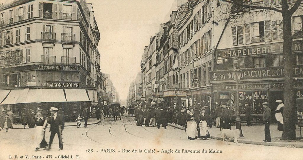 Un peu plus loin, le n° 67 avenue du Maine (4e bâtiment de deux étages à droite) était animé en permanence par le Café-Concert de la Gaîté-Montparnasse ► voir ici , ouvert en septembre 1868 par François Jamin, affermé, à partir de 1883, à Georges Corrard dit Dorfeuil (1848-1904) qui y donnera jusqu’à son décès, de nombreuses revues, notamment avec la participation d’Yvette Guilbert, Dranem, Mayol, Polin, Dorville… Au début des années 1890, une seconde entrée est aménagée du côté de la rue de la Gaîté, au n° 24-26, sous l’enseigne de Théâtre de la Gaîté-Montparnasse, bien souvent confondu avec le Théâtre Montparnasse situé n° 31 en face.