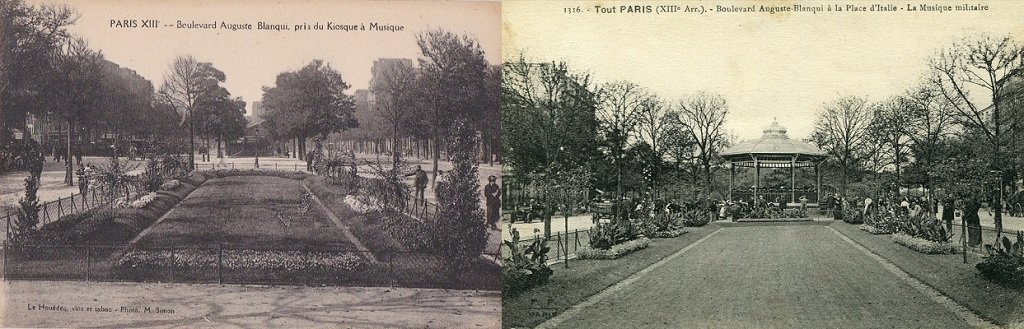 Mais ce que nous ne voyons pas encore, c’est le Kiosque à musique qui prendra place sur le terre-plein de la contre-allée, en perspective de la station Corvisart.