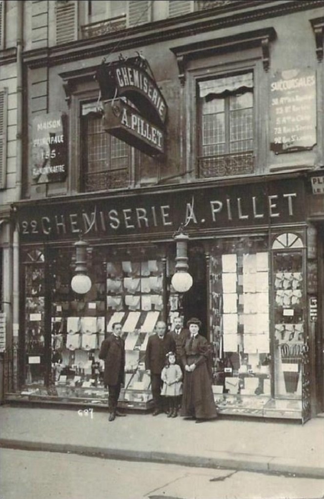 ► voir ici succursale Chemises Pillet 22 avenue des Ternes Alors que les cinq succursales chemises A. Pillet sont toujours actives en 1914, la maison mère du 155 rue de Montmartre et son atelier de fabrication sont cédés, à cette date, à un certain Fourré.