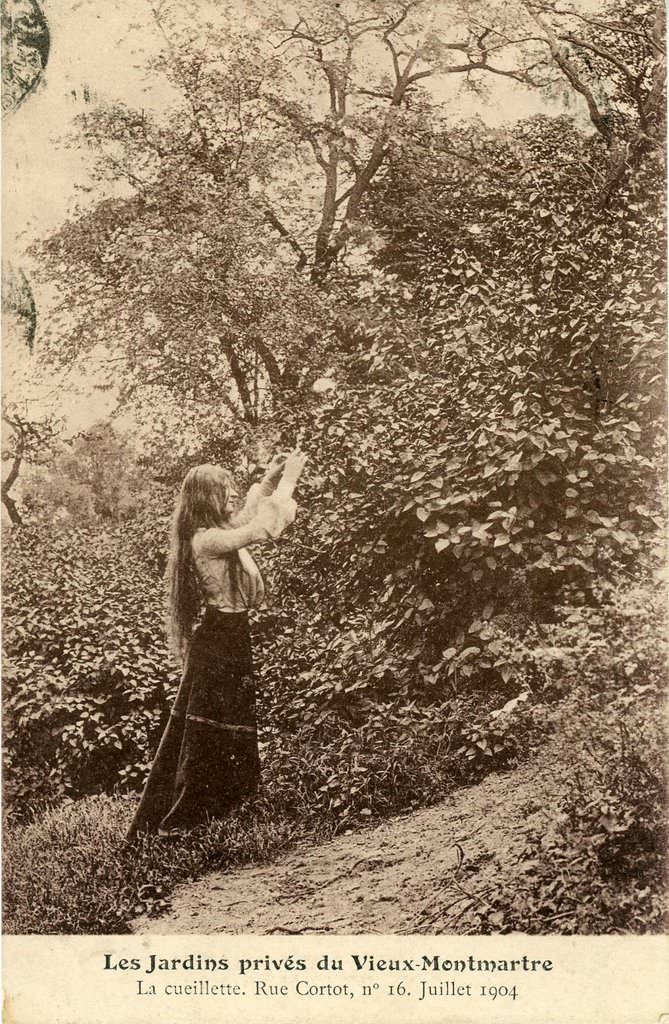 Les Jardins privés du Vieux-Montmartre. — La cueillette. Rue Cortot, n°16. Juillet 1904