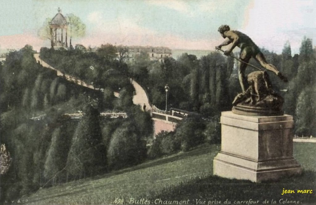 En 1942, cette sculpture, très certainement la plus emblématique des Buttes-Chaumont de par son emplacement grandiose, est emmenée, comme toutes les autres œuvres du Parc, dans les usines d’armement allemandes.