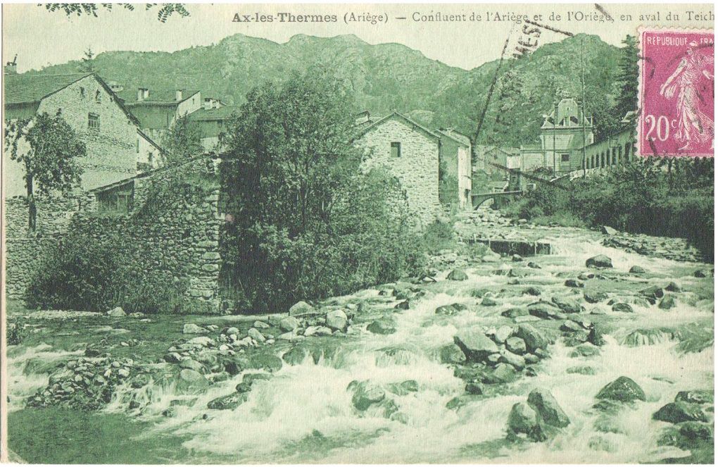 comme son nom l'indique, Ax-les-thermes est une ville où l'eau joue un rôle important. Au fond à droite, le grand bâtiment qui ressemble à une gare sont les thermes du Teich. Quant à l'Oriège, la rivière qui descend de la vallée d'Orlu, elle est connue car elle est "aurifère" : on y trouve des petites pépites d'or. Classe, non ?