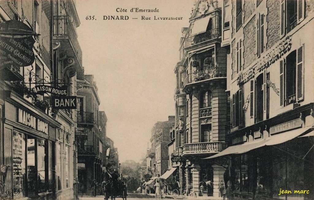 A gauche, le magasin « Aux Bons Parapluies » du n°21 rue Levavasseur était tenu par Alain Joseph Gagnou, ancien marin, son épouse Marie Louise Sort (mariés à Saint-Servan le 27 novembre 1867) et leur fille Amélie Françoise Gagnou née à Dinard le 31 janvier 1875. Le 7 octobre 1905, les époux Gagnou marient à Dinard leur fille à Auguste Joseph Ernest Adolphe Cloutier (1870-1925), originaire de Miniac, adjudant d’infanterie coloniale en retraite demeurant à Rennes. Aussitôt l’enseigne de la boutique de parapluies est modifiée en conséquence, devenant « Cloutier - Gagnou ».