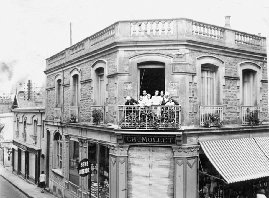En second plan gauche, à l’angle du n°16 rue Levavasseur et de la rue de Paris, le rez-de-chaussée de l’immeuble à balustrade est occupé par l’épicerie anglaise de Charles Mollet (1868-1951), originaire de Jersey, qui, après épousé avoir avait épousé Margaret-Mary Ellis (1866-1908), s’y était installé vers 1900.