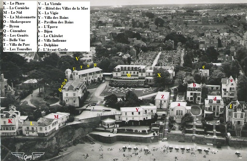 Villas de gauche à droite : La Mascotte ; Le Phare ; La Corniche ; Le Nid : Salon de thé ; Castel Saint-François (tourelle) ; La Maisonnette – Shakespeare – Byron – Cézembre ; Villa des Bains (Établissement de Bains)