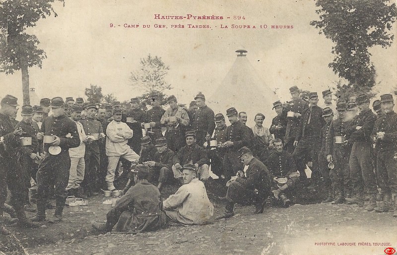 8. - Camp de Ger, près Tarbes. - Groupe de Soldats du 12°- Épluchage de Pommes de terre