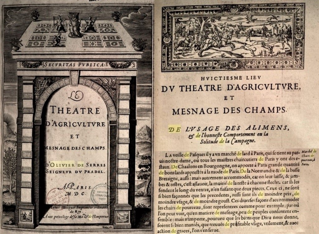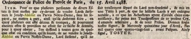 Jean Tostée, prévôt de Paris, par une ordonnance du 15 avril 1488, oblige, sous peine d’amende arbitraire et de prison, qu’à cette foire, le lard sursemé — viande de porc malade ayant des grains de ladrerie — soit mis en une table à part, clairement indiqué aux acheteurs et totalement séparé du lard non sursemé. (► voir ici ordonnance 15 avril 1488 du Prévôt de Paris Jean Tostée) En 1600, Olivier de Serres, seigneur du Pradel (1539-1619), agronome, nous donne les deux manières d’accommoder et apprêter les chairs de pourceau, lors de ce Marché du Lard pascal. (► voir ici extrait du théâtre d’agriculture d’Olivier de Serres, 1600)