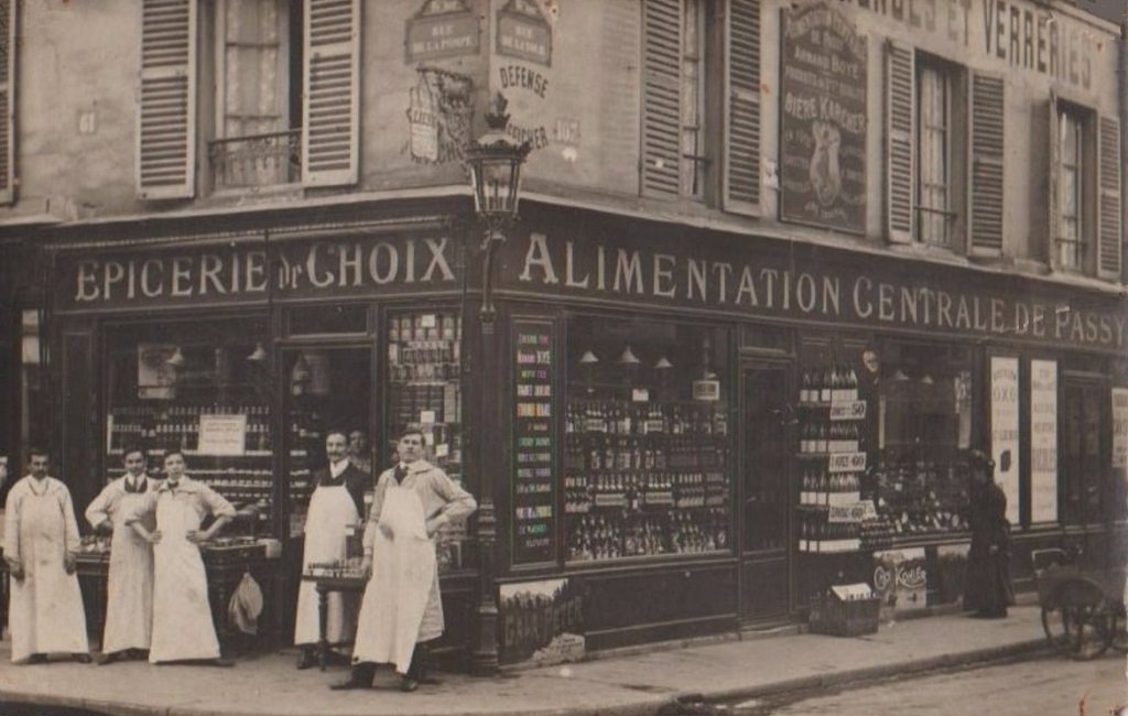 Dorénavant la vitrine de l’épicerie est surmontée des inscriptions suivantes : Epicerie de Choix - Alimentation Générale de Passy.