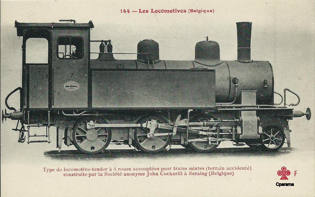 144 - Locomotive-tender n°7, type 130T pour trains mixtes sur lignes à profil accidenté, construite par la Société anonyme John Cockerill à Seraing (Belgique) pour les Chemins de fer Belges - Editeur : F.Fleury.