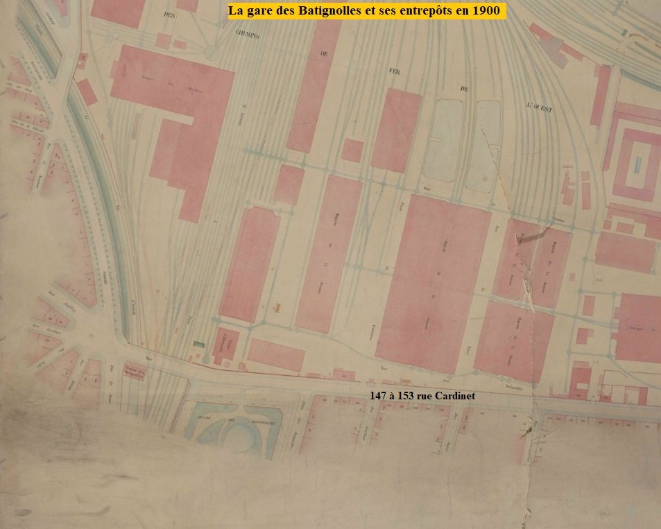 En avril 1843, alors que cinq cents ouvriers sont occupés à aménager un nouvel embarcadère rue Saint-Lazare pour cette ligne, on annonce qu’à Batignolles,on construit d'immenses bâtimens pour le déchargement et l'entreposage des marchandises.Cette gare, de 250 mètres de long et de 100 mètres de large, immédiatement après le Pont Cardinet, est destinée à recevoir en stationnement les marchandises arrivant de Saint-Germain, et qui viendront, près de Paris, attendre les besoins de la consommation. Cet établissement est du plus haut intérêt pour le commerce des Batignolles, où il créera un vaste marché de combustibles et autres matières premières. L’emplacement de cette gare de marchandises et de ses entrepôts était occupé jusqu’à l’année précédente par des champs cultivés circonscrits au midi par un chemin nom dénommé signalé sur les cartes — mais qui est en fait la rue Cardinet, attestée dès 1793 — et situé dans le prolongement de la rue du Port de Saint-Ouen, à l’ouest par la voie de chemin de fer Paris Saint-Germain-en-Laye et la rue Jeanne d’Asnières, au nord par la future voie de chemin de fer de petite ceinture et à l’est par le chemin de ronde de l’Entrepôt, voie parallèle à l’avenue de Clichy.