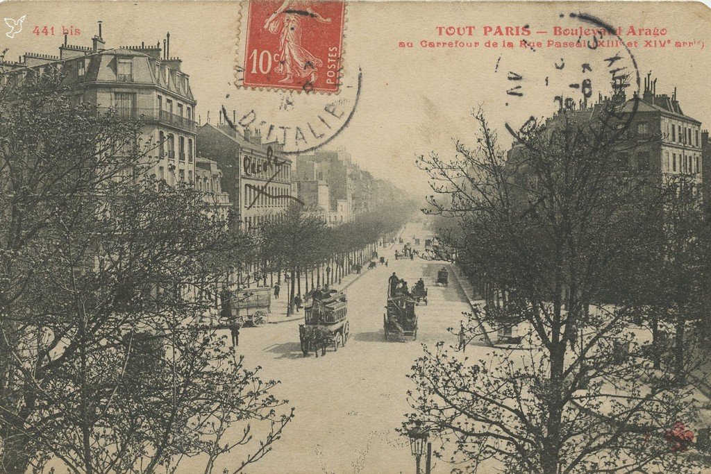 Nous sommes boulevard Arago avec, à notre gauche, l’entrée de la rue Broca et, à droite, l’autre portion de la rue Broca devenue rue Léon-Maurice-Nordmann et, en biais, l’amorce de la rue de Julienne. Le carrefour de la rue Pascal n’est pas précisément visible sur cette Cpa puisque situé au fond. ► voir ici le boulevard Arago vu du carrefour de la rue Pascal