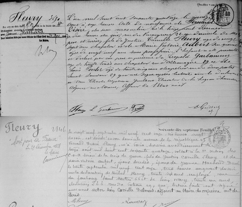 ► voir ici Actes d’état-civil de naissance et de décès de Fernand Désiré Fleury