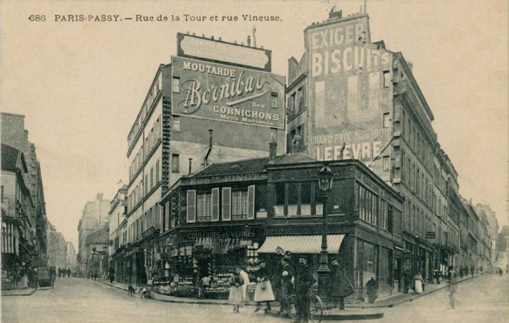 Jusqu’en 1905, Eugène Pinot règne en maître, pour ce qui est de la quincaillerie et de l’entretien, sur cet emplacement, son vis-à-vis au n°1 rue de la Tour (angle 2 rue de Passy) étant occupé par des marchands de vins.