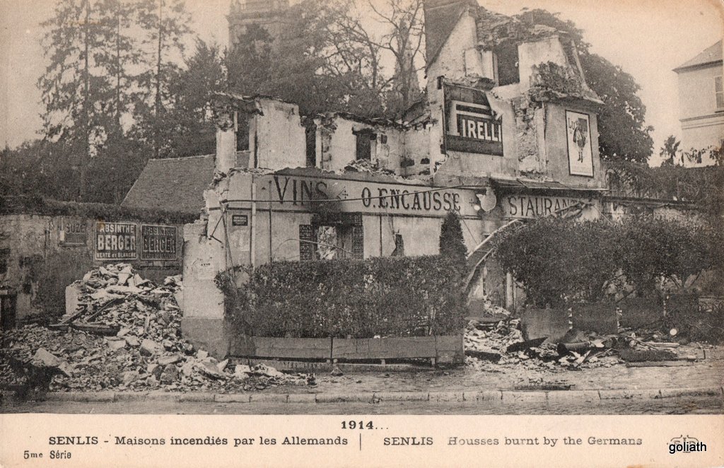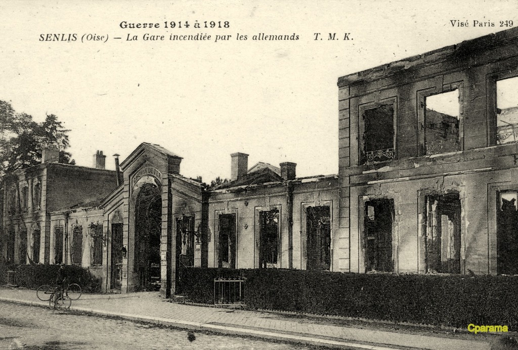 L’entrée de la gare de Senlis, incendiée par les troupes allemandes le 2 septembre 1914 ; le bâtiment voyageurs de 1861 a étè aussi dévasté. La décision est prise de le démolir au lieu de le reconstruire, en faveur d'un bâtiment tout neuf. C'est dans le cadre de ce projet qu'intervient Gustave Umbdenstock, architecte de la Compagnie. Le nouveau bâtiment est construit en 1922.