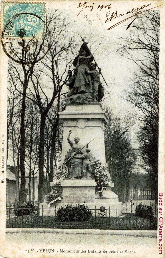 :arrow: 23 M. - MELUN. - Monument des Enfants de Seine-et-Marne * 23.- M. Thibault, édit., Melun * Dos divisé - Circulée le 03 Juin 1906