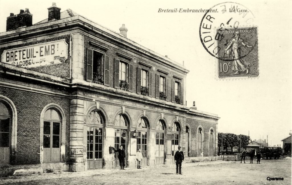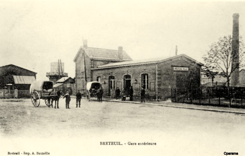 La « station de Breteuil », est officiellement mise en service le 21 juin 1846 par la Compagnie des chemins de fer du Nord, lorsqu'elle ouvre à l'exploitation sa ligne de Paris à Lille et Valenciennes. Elle est établie au village de Bacouël sur la route de Montdidier à Breteuil. Le 9 mars 2015, cette ancienne gare est devenue un simple point d'arrêt non géré du fait de la fermeture du bâtiment voyageurs. La carte a été envoyée en 1905.